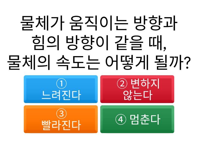 1) 물체가 움직이는 방향과 힘의 방향이 같을 때, 물체의 속도는 어떻게 될까? a) ① 느려진다 b) ② 변하지 않는다 c) ③ 빨라진다 d) ④ 멈춘다