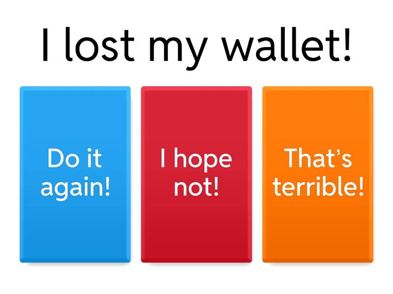 1) I lost my wallet! a) Do it again! b) I hope not! c) That’s terrible! 2) I passed my English exam! a) Congratulations! b) That’s too bad. c) I’m not hungry. 3) I can’t open this bottle. a) Never mind. b) Me too. c) Let me help you. 4) I think I have a fever. a) I agree with the rules. b) I can’t stand football. c) You should see a doctor. 5) I want to learn French next year. a) That sounds interesting! b) Please close the window. c) I don’t like cheese. 6) My phone battery is dead. a) Charge it later. b) I’m afraid of dogs. c) Use mine if you want. 7) Are you free after school? a) I don’t remember. b) Yes, I have time. c) That’s my sister. 8) I finally bought a new laptop! a) I can’t go there. b) I don’t have water. c) That must be exciting! 9) I’m moving to another city next month. a) Why not? b) Turn left here. c) That’s a big change! 10) I forgot to do my homework. a) You’re in line. b) Oh no! Again? c) It’s the last bottle. 11) I can’t eat spicy food. a) I understand you. b) That’s too cheap. c) I don’t like cold weather. 12) My head hurts. a) Try to rest. b) Try to dance. c) Try to sing. 13) I got a new job! a) I’ll take the bus. b) That’s wonderful! c) Let’s change tables. 14) I need to finish this project today. a) I broke the chair. b) You can do it! c) I paid in cash. 15) I left my umbrella at home. a) I bought tomatoes. b) Don’t use headphones. c) It might rain later. 16) I can’t find my keys. a) Turn the volume up. b) Wash your hands. c) Look under the sofa. 17) My parents are visiting this weekend. a) I closed the window. b) I ate the whole pizza. c) That’s great news! 18) I think I failed the exam. a) I hope not… b) I hope so… c) I hope you dance. 19) My team lost the match. a) I’m happy for you. b) I’m sorry to hear that. c) I don’t remember the number. 20) I’m hungry. a) It was expensive. b) Turn it off. c) Let’s get something to eat. 21) I need a vacation. a) I don’t like cats. b) Me too! c) I’m not tired. 22) I forgot my lunch. a) It’s raining outside. b) Share mine. c) I’m not hungry. 23) I’m learning to swim. a) I don’t swim. b) I like reading. c) That’s exciting! 24) I’m allergic to peanuts. a) I love peanuts. b) Be careful then. c) I’m allergic to cats. 25) I’m going to the gym. a) I don’t like gyms. b) Have a great workout! c) I’m going to sleep. 26) I’m feeling sick today. a) Get well soon! b) I’m feeling great. c) I’m going shopping. 27) I’m moving to a new house. a) I don’t like moving. b) I’m staying here. c) That’s exciting! 28) I’m going to a concert tonight. a) I don’t like music. b) I’m staying home. c) Have fun! 29) I’m learning to play guitar. a) I don’t like music. b) That’s awesome! c) I play piano. 30) I’m going to the beach this weekend. a) I’m staying home. b) I don’t like sand. c) Enjoy the sun!