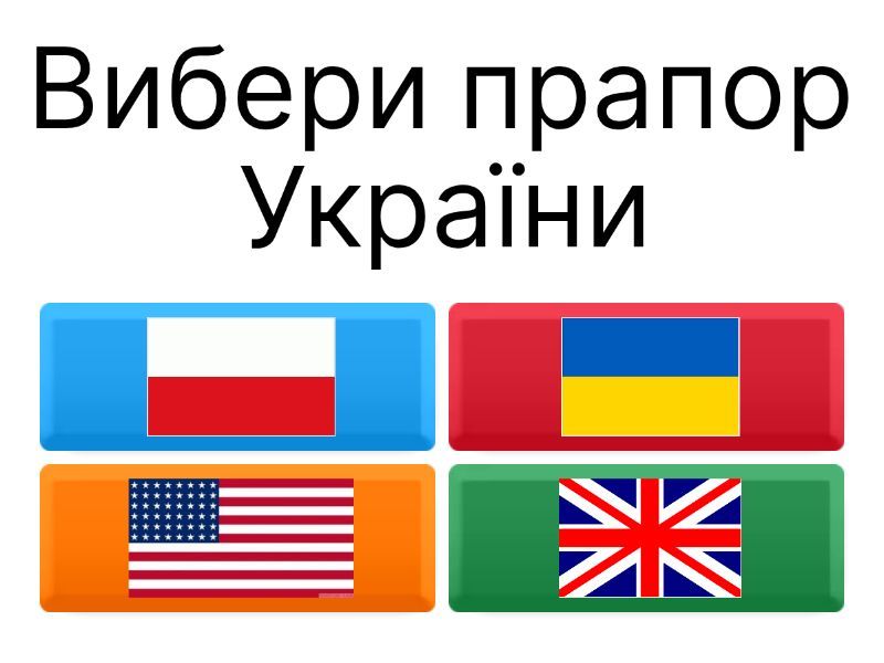 1) Вибери прапор України a) b) c) d) 2) Герб України a) b) c) d) 3) Национальний одяг українців a) b) c) d) 4) Українська страва a) b) c) d) 5) Символи України a) b) c) d) 6) Карта України a) b) c) d) 7) Столиця України a) b) c) d)