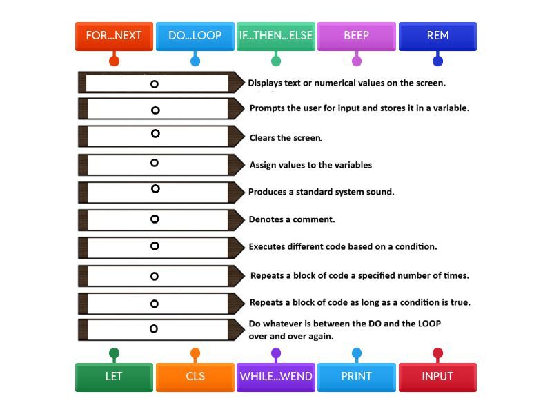 PRINT, INPUT, CLS, LET, BEEP, REM, IF...THEN...ELSE, FOR...NEXT, WHILE...WEND, DO...LOOP.