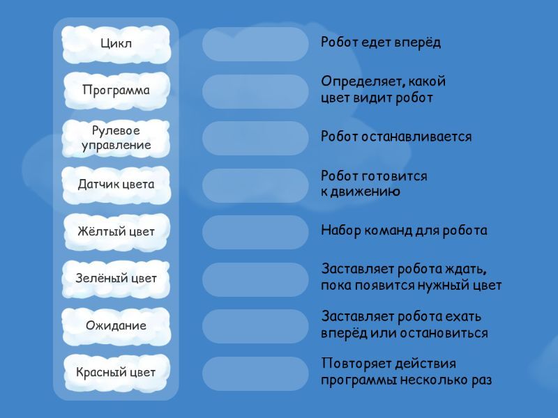 Рулевое управление - Заставляет робота ехать вперёд или остановиться, Ожидание - Заставляет робота ждать, пока появится нужный цвет, Датчик цвета - Определяет, какой цвет видит робот, Цикл - Повторяет действия программы несколько раз, Красный цвет - Робот останавливается, Зелёный цвет - Робот едет вперёд, Жёлтый цвет - Робот готовится к движению, Программа - Набор команд для робота,