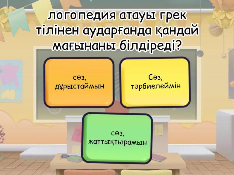 1) логопедия атауы грек тілінен аударғанда қандай мағынаны білдіреді? a) сөз, дұрыстаймын b) Сөз, тәрбиелеймін c) сөз, жаттықтырамын 2) Сөйлеу дегеніміз не? a) адамның қоғамдағы қарым-қатынас құралы b) ой-қабілет c) адамның ән айтып, көңіл көтеруі 3) Л.С.Выготский қимыл-қозғалыстың қандай жоспарын белгілеген? a) іштей бағдарлама жасау b) түрткі-ой-ішкі-сөз-сыртқы-сөз c) моторлы іске асыру 4) Балалардың жіберетін жиі қателіктері a) дыбысты дұрыс айтпау, дыбысты алмастыру b) қимыл-қозғалыс ойындарын дұрыс ойнамау c) сабақ кезінде тыңдамау 5) Логопедияның принциптері? a) көрнекілік,саналылық,қолжетімділік b) жүйелілік,жанжақтылық,кешенді,дамытушылық,онтогенетикалық,динамикалық c) танымдылық,психикалық,педагогикалық 6) Логопедияның зерттеу нысаны? a) сөйлеу тілінің бұзылуынан зардап шеккен тұлға b) көру қабілеті бұзылған тұрлға c) есту қабілеті бұзылған тұлға 7) сөйлеу неше кезеңнен тұрады? a) тыныс алу,жүгіру b) химиялық,биологиялық,математикалық c) психикалық ,физиологиялық,артикуляциялық 8) Артикуляциялық аппарат? a) өңеш,асқазан,бүйрек b) тіл,ерін,тіс,таңдай c) ми,жұлын,ішек