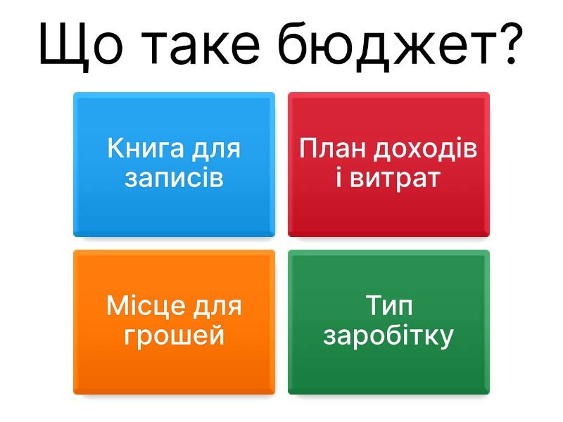 1) Що таке бюджет? a) Книга для записів b) План доходів і витрат c) Місце для грошей d) Тип заробітку 2) Доходи — це: a) Гроші, які ви отримуєте b) Гроші, які витрачаєте c) Вартість продуктів d) Збереження у банку 3) Витрати — це: a) Гроші, які приходять b) Гроші, які ви витрачаєте c) Те, що зберігаєте d) Кредити 4) Який з варіантів можна віднести до витрат сім’ї? a) Зарплата b) Премія c) Продаж старих речей d) Покупка продуктів 5) Що таке заощадження? a) Витрати на розваги b) Борг c) Гроші, які відкладають на майбутнє d) Кредит 6) Яку частину доходів рекомендують відкладати на заощадження? a) 10–20% b) 50% c) 80% d) Нічого 7) Що допомагає контролювати витрати? a) Рахунок у банку b) Кредитна карта c) Зайві покупки d) Планування бюджету 8) Ви отримали 500 грн кишенькових. Купили книгу за 150 грн і морозиво за 50 грн. Скільки грошей залишилось? a) 250 грн b) 200 грн c) 150 грн d) 300 грн 9) Що краще робити, якщо хочете купити дорогу річ, але грошей не вистачає? a) Взяти кредит b) Відкласти гроші і накопичити c) Попросити у друзів d) Витратити всі гроші 10) Що допомагає зрозуміти, куди йдуть гроші і що можна змінити? a) Щоденник b) Телевізор c) Таблиця доходів і витрат d) Листівка