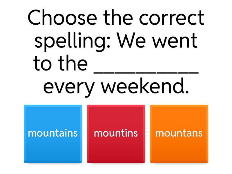 1) Choose the correct spelling: We went to the __________ every weekend. a) mountains b) mountins c) mountans 2) Choose the correct word: _________ were flowers. a) their b) they’re c) there 3) Choose the correct spelling: We could smell the __________. a) flours b) flowers c) flowrs 4) Choose the correct sentence: a) We couldnt carry the rocks because they was too heavy. b) We couldn’t carry the rocks because they were to heavy. c) We couldn’t carry the rocks because they were too heavy. 5) Choose the correct word: My grandpa could fix __________ that was broken. a) some thing b) somthing c) something 6) Choose the correct spelling: We climbed the __________ rocks. a) little b) litel c) littel 7) Which sentence is correct? a) In the mountains their were flowers everywhere. b) In the mountains there were flowers everywhere. c) In the mountains they’re were flowers everywhere. 8) Choose the correct connector: We went to the mountains __________ we visited my grandparents. a) also b) too c) when 9) Choose the correct word: We caught fish in the river, but now we can't catch fish __________. a) to b) too c) anymore 10) Choose the correct spelling: We went __________ the mountains. a) every time b) everytime c) evrytime 11) Choose the correct past tense sentence: a) We climb rocks every day. b) We climbing rocks every time. c) We climbed rocks every time. 12) Choose the correct form: We __________ carry the rocks. a) couldnt b) couldn’t c) could’nt 13) Choose the correct sentence order: a) We went to the mountains and climb little rocks. b) We go to the mountains and climbed little rocks. c) We went to the mountains and climbed little rocks. 14) What is the correct form? Their were many big rocks. a) Incorrect – it should be there b) Correct c) Incorrect – it should be they’re 15) Choose the correct connector: We went hiking, __________ we saw lots of animals. a) and b) because c) too 16) Choose the correct spelling: The rocks were __________ heavy. a) too b) to c) two 17) Choose the correct version: a) There house was very old. b) Their house was very old. c) They’re house was very old.