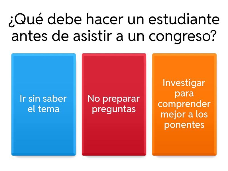 1) ¿Qué debe hacer un estudiante antes de asistir a un congreso? a) Ir sin saber el tema b) No preparar preguntas c) Investigar para comprender mejor a los ponentes 2) ¿Qué significa “construir conocimiento”? a) Memorizar y olvidar después b) Crear ideas nuevas a partir de lo que aprendemos c) Copiar conceptos sin entenderlos 3) 4. ¿Cuál es el propósito de aplicar técnicas de análisis en un proyecto? a) Hacer más largo el trabajo b) b) Entender profundamente el contenido y tomar decisiones