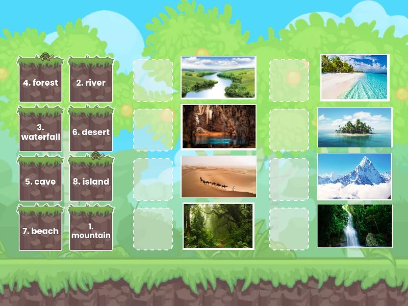 6. desert, 8. island, 5. cave, 2. river, 3. waterfall, 1. mountain, 4. forest, 7. beach,
