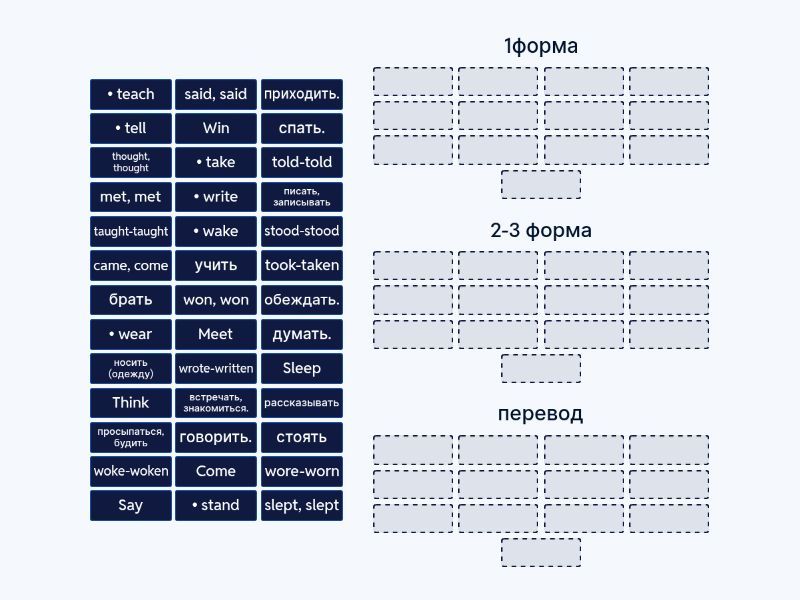 1форма: • stand, • take, • teach, • tell, • wake, • wear, • write, Meet, Come, Say, Think, Win, Sleep, 2-3 форма : stood-stood, took-taken , taught-taught , told-told , woke-woken, wore-worn , wrote-written , met, met , came, come, said, said , thought, thought , won, won , slept, slept, перевод: стоять, брать, учить, рассказывать, просыпаться, будить, носить (одежду), писать, записывать, встречать, знакомиться., приходить., говорить., думать., обеждать., спать.,