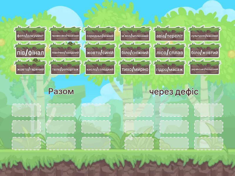 Разом: теле/репортаж, середньо/вічний, гідро/масаж, лісо/сплав, фото/документ, жовто/гарячий, авіа/переліт, біло/сніжний, пів/фінал, через дефіс: культурно/масовий, українсько/польський, м'ясо/молочний, професійно/технічний, жовто/синій, північно/західний, кисло/солодкий, біло/жовтий, тихо/мирно,