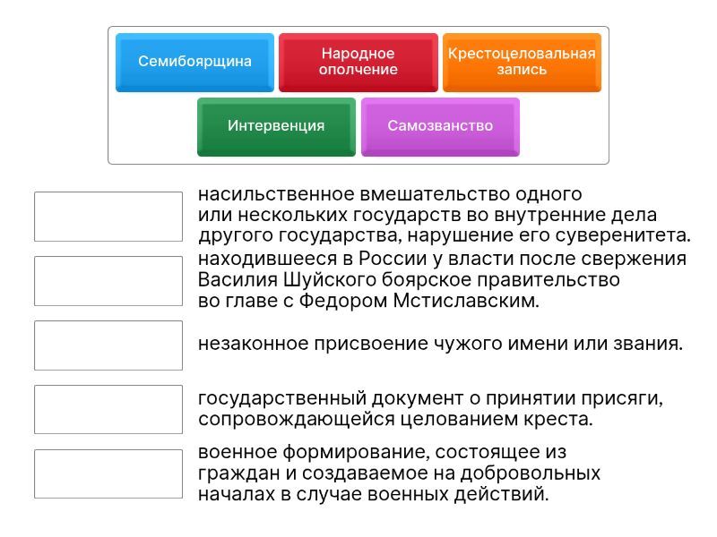 Народное ополчение - военное формирование, состоящее из граждан и создаваемое на добровольных началах в случае военных действий., Самозванство - незаконное присвоение чужого имени или звания., Крестоцеловальная запись - государственный документ о принятии присяги, сопровождающейся целованием креста., Семибоярщина - находившееся в России у власти после свержения Василия Шуйского боярское правительство во главе с Федором Мстиславским., Интервенция - насильственное вмешательство одного или нескольких государств во внутренние дела другого государства, нарушение его суверенитета.,