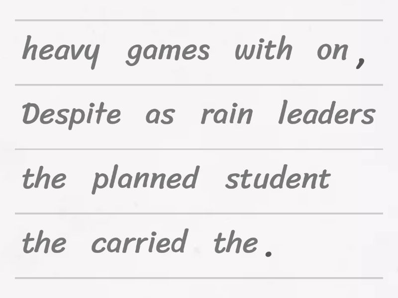 Despite the heavy rain, the student leaders carried on with the games as planned., Although the weather was bad, we enjoyed ourselves., Because of the singer’s popularity, her concert tickets were sold out in a day., Due to the rain, the students could not play outside., Due to Sam’s deceit, Holly was devastated., Until Father has finished preparing dinner, we cannot eat., No sooner had I brought out the cake than the guests arrived., Upon hearing the news, everyone was surprised., After finishing their homework, the boys played computer games., The events are being postponed by the organising committee due to adverse weather., Mr Lim asked the boys if they had managed to finish their work the previous day., Jo asked Amelia who her dance partner for the party was., Siti commented that she and John had been watching that highly recommended movie the previous day., Gil asked her friend who had taken her pen on the table., The children asked Mother what time Father would come home that day., My bicycle is being repaired by my father over the weekend., Having come in first in the singing contest, Jo jumped with joy., Separating the north and south of the country is a mountain range., The scouts’ enthusiasm and discipline impressed their teacher., It was with excitement that Devi signed up for the course., Beiyue did well at the end of the year by persisting in her efforts., Not only did Sashi win the race, but she also set a new record., On seeing her birthday present, Aisha smiled., Kelly’s regular absence was noticed by her classmates., Before leaving school, the pupils submitted their homework.,