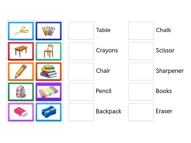 Pencil, Eraser, Books, Table, Sharpener, Backpack, Chalk, Scissor, Crayons, Chair,