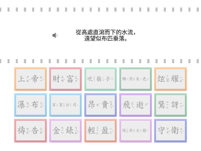 從高處直瀉而下的水流, 遠望似布匹垂落。, 有價值或能滿足人類所需的物品。, 誇耀、誇顯。, 黯淡而失去光彩。, 金色的懷。 懷錶是一種沒有錶帶、 隨身攜帶的鐘錶,使用時從衣服口袋掏出來觀看。, 看守、防衛的人。, 形容盛怒的樣子。, 輕鬆愉快。, 快速消逝。, 集各類商品於一處, 依其類別分部售賣的商店。規模較大、貨品較多。, 祝告鬼神或上帝,以求福佑。, 基督教教徒對所信仰、 崇拜的神的稱呼。, 驚奇訝異。, 忽然完全明白。, 價格很高。,