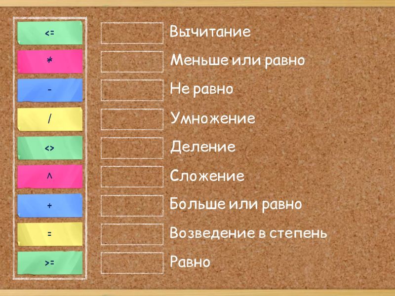* - Умножение, / - Деление, ^ - Возведение в степень, + - Сложение, - - Вычитание, >= - Больше или равно, <= - Меньше или равно, = - Равно, <> - Не равно,