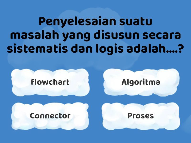 1) Penyelesaian suatu masalah yang disusun secara sistematis dan logis adalah....? a) flowchart b) Algoritma c) Connector d) Proses 2) Urutan atau langkah - langkah yang disusun secara sistematis dan logis menggunakan simbol - simbol tertentu adalah....?  a) Data b) Mind map c) Flowchart d) Algoritma 3) Ada berapa simbol - simbol tertentu dalam flowchart....? a) 8 b) 6 c) 9 d) 10 4) Simbol flowchart persegi panjang yang menunjukkan langkah aliran proses normal yang ada di dalam sebuah sistem adalah....?  a) Document b) Flow c) Data d) Proses 5) Simbol flowchart oval yang menunjukan awal atau akhir sebuah proses dan prosedur adalah....? a) Proses b) Decision c) Terminator d) Data 6) Simbol flowchart jajar genjang yang menunjukan input atau output Data ( 0/1 ) dalam suatu sistem atau proses adalah....? a) Data b) Flow c) Terminator d) Document 7) Simbol yang menentukan arah jalur atur dalam suatu sistem dan prosedur adalah....? a) Proses b) Flow c) Data d) Decision 8) Cara memetakan sebuah pikiran ide gagasan secara terstruktur adalah....? a) Flowchart b) Proses c) Algoritma d) Mind Map 9) Langkah pertama membuat mind Map adalah....?  a) Membuat kerangka b) Menentukan judul  c) Tentukan cabang utama  d) menentukan struktur 10) Ada berapa jenis Mind Map....? a) 4 b) 5 c) 8 d) 2