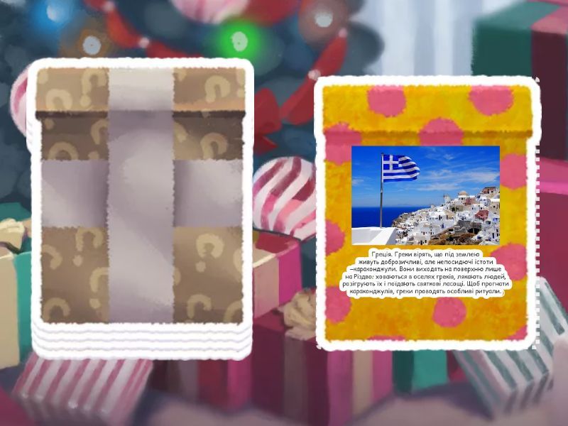 Німеччина. На Різдво майже в усіх німецьких містах проходять ярмарки. Люди збираються на міських площах, щоб послухати духові оркестри та скуштувати традиційні місцеві ласощі. Особливо німці полюбляють імбирні пряники у формі серця та смажений мигдаль із цукром, а запивають їх глінтвейном або яблучним сидром., Греція. Греки вірять, що під землею живуть доброзичливі, але непосидючі істоти –караконджули. Вони виходять на поверхню лише на Різдво: ховаються в оселях греків, лякають людей, розігрують їх і поїдають святкові ласощі. Щоб прогнати караконджулів, греки проводять особливі ритуали., Великій Британія. У Великій Британії дорослі й діти обожнюють святкові хлопавки – традиційні забавки в яскравих обгортках. Якщо потягнути за кінці обгортки, пролунає гучний постріл, а з хлопавки посиплються подарунки, жарти, іграшки та паперові капелюхи., Франція. У Франції на Різдво діти ставлять своє взуття біля каміна. Якщо протягом року вони добре поводилися, Пер Ноель покладе у взуття подарунки., Ісландія. В Ісландії на Різдво родичі дарують одне одному теплий одяг. Місцеві жителі вірять, що тих, хто не підготувався до зимових холодів, може проковтнути жахливий різдвяний кіт. Лише теплий одяг допоможе вберегтися від нього..