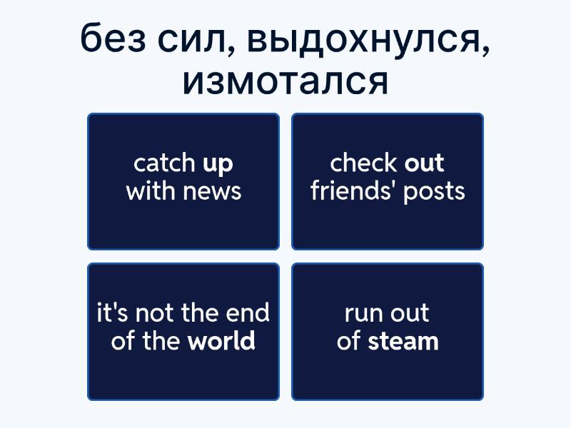 1) без сил, выдохнулся, измотался a) catch up with news b) check out friends' posts c) it's not the end of the world d) run out of steam 2) вздохнуть с облегчением a) a storm in a teacup b) keep up with gossip c) run out of steam d) breathe a sigh of relief 3) потерять голову a) it's not the end of the world b) a storm in a teacup c) lose a head d) run out of steam 4) это не конец света a) run out of steam b) catch up with news c) breathe a sigh of relief d) it's not the end of the world 5) буря в стакане воды a) a storm in a teacup b) phone-in program on the radio c) lose a head d) it's not the end of the world 6) быть в курсе новостей a) catch up with news b) a storm in a teacup c) run out of steam d) lose a head 7) программа телефонного разговора на радио a) a storm in a teacup b) it's not the end of the world c) phone-in program on the radio d) run out of steam 8) проверить, оценить посты друзей a) keep up with gossip b) catch up with news c) breathe a sigh of relief d) check out friends' posts 9) быть в курсе сплетен a) lose a head b) keep up with gossip c) run out of steam d) a storm in a teacup