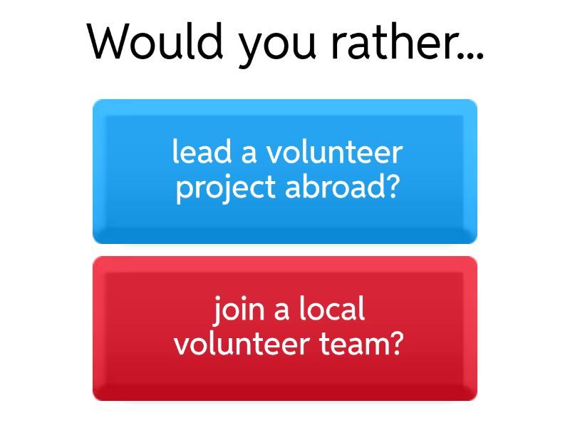 1) Would you rather... a) lead a volunteer project abroad? b) join a local volunteer team? 2) Would you rather... a) Control the project budget b) Manage the project schedule 3) Would you rather... a) Work with limited resources b) Work under a very tight deadline 4) Would you rather... a) Learn new skills outside your job b) Use only the skills you already have 5) Would you rather... a) Receive updates every day b) Receive updates only at the end of each milestone 6) Would you rather... a) Volunteer for 40 paid hours a year b) Join a 3-month overseas volunteer program 7) Would you rather... a) Organize the volunteer team b) Communicate with external partners 8) Would you rather... a) Complete one big milestone early b) Complete several small milestones on time 9) Would you rather... a) Teach children b) Help in an environmental project 10) Would you rather... a) Be fully responsible for the whole volunteer project b) Share responsibility with your team