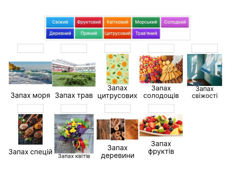 Квітковий - Запах квітів, Фруктовий - Запах фруктів, Деревний - Запах деревини, Свіжий - Запах свіжості, Солодкий - Запах солодощів, Цитрусовий - Запах цитрусових, Пряний - Запах спецій, Морський - Запах моря, Трав'яний - Запах трав,
