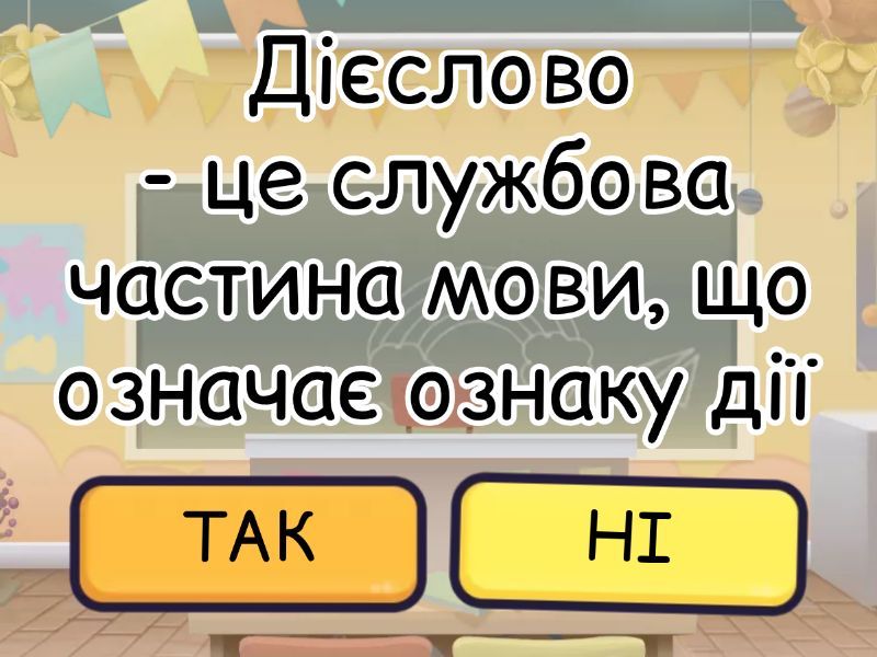 1) Дієслово - це службова частина мови, що означає ознаку дії a) ТАК b) НІ 2) Дієвідміни у дієслів визначаються за 3 особою множини a) ТАК b) НІ 3) Дієслова мають три дієвідміни a) ТАК b) НІ 4) Дієслова І дієвідміни у 3 особі множини мають закінчення –ать, -ять a) ТАК b) НІ 5) Дієслова ІІ дієвідміни у 3 особі множини мають закінчення –ать, -ять a) ТАК b) НІ 6) Щоб визначити дієвідміну дієслів, потрібно поставити дієслово у минулому часі a) ТАК b) НІ 7) У деяких дієсловах при дієвідмінюванні може відбуватися чергування приголосних звуківУ деяких дієсловах при дієвідмінюванні може відбуватися чергування приголосних звуків a) ТАК b) НІ 8) Дієслова І дієвідміни у 3 особі однини мають закінчення –е, ( -є)Дієслова І дієвідміни у 3 особі однини мають закінчення –е, ( -є) a) ТАК b) НІ 9) Дієвідміни мають дієслова теперішнього і майбутнього часуДієвідміни мають дієслова теперішнього і майбутнього часу Дієвідміни мають дієслова теперішнього і майбутнього часу  a) ТАК b) НІ 10) Дієслова минулого часу змінюються за особами a) ТАК b) НІ 11) Дієслова теперішнього часу мають тільки доконаний вид a) ТАК b) НІ 12) Дієслова майбутнього часу бувають як доконаного, так і недоконаного виду a) ТАК b) НІ