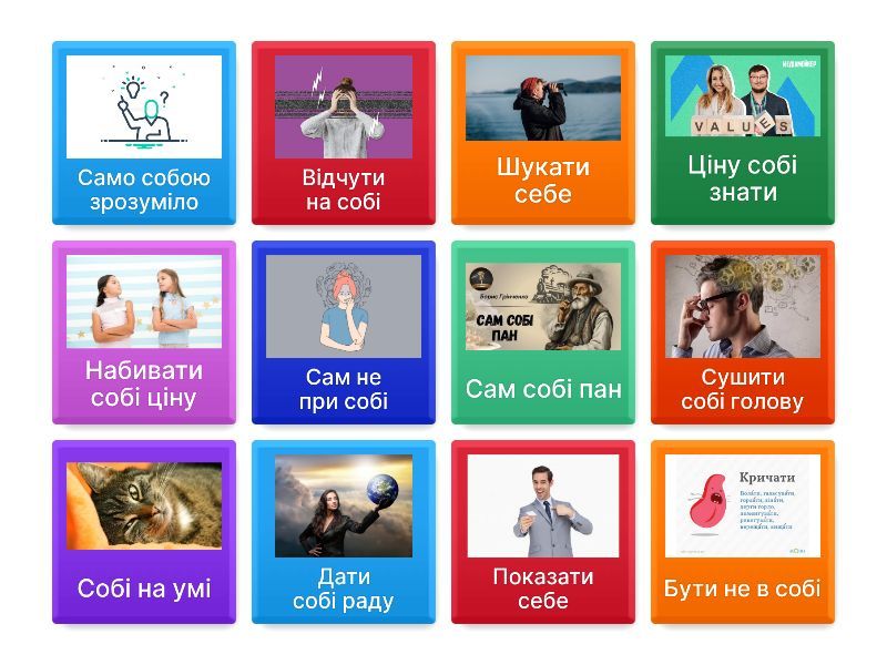Собі на умі - Людина має власні приховані плани; не все говорить уголос., Дати собі раду - Самостійно впоратися з проблемою, знайти рішення., Само собою зрозуміло - Це очевидно, не потребує пояснення., Сам собі пан - Незалежна людина, що сама вирішує й керує своїм життям., Показати себе - Продемонструвати свої здібності або характер у певній ситуації., Відчути на собі - Особисто пережити певний досвід (часто неприємний)., Бути не в собі - Бути знервованим, роздратованим або неадекватно реагувати.., Сам не при собі - Бути неуважним, розгубленим або заглибленим у власні думки., Сушити собі голову - Довго й марно думати над чимось, надмірно турбуватися., Ціну собі знати - Усвідомлювати власну гідність і свою справжню вартість., Шукати себе - Шукати свій шлях у житті, своє покликання чи ідентичність., Набивати собі ціну - Спробувати виглядати кращим або важливішим, ніж є насправді.,