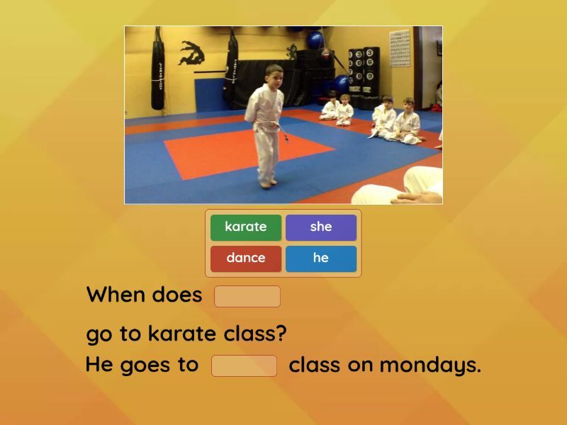 When does ____ go to karate class? He goes to ____ class on mondays. When does she ____ to dance class? She goes to dance class on ____. When does he go to ____ class? He ____ to swimming class on fridays. When does ____ go to english class? She goes to ____ class on thursdays. When does she ____ to karate class? ____ goes to karate class on tuesdays. When does he go to ____ class? He ____ to dance class on saturdays. When does she go to ____ class? ____ to swimming class on mondays. When does he go to ____? ____ to english class on wednesdays.