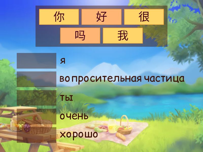 你 - ты, 好 - хорошо, 很 - очень, 吗 - вопросительная частица, 我 - я,