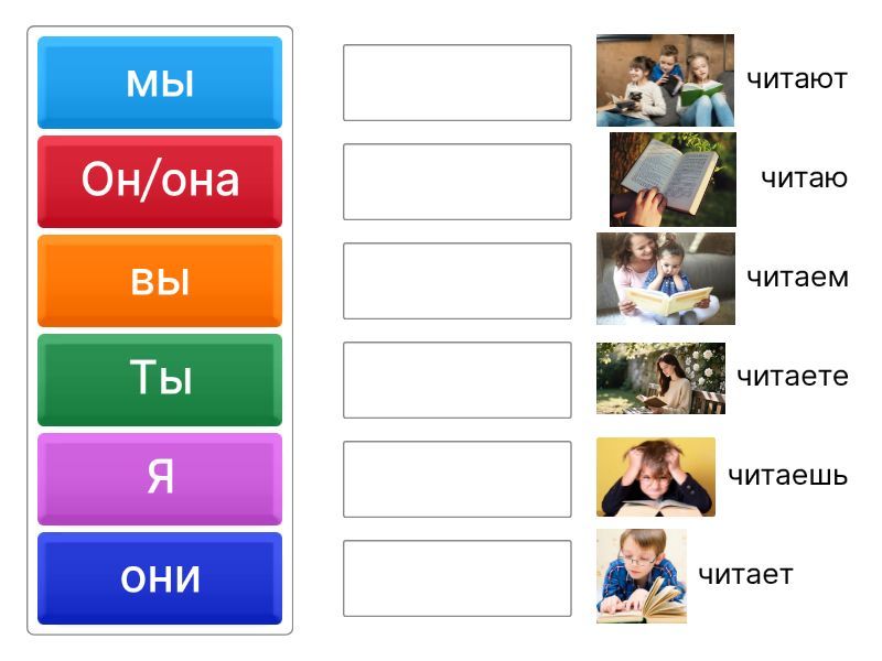 Я - читаю, Ты - читаешь, Он/она - читает, мы - читаем, вы - читаете, они - читают,
