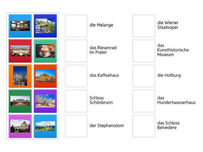 der Stephansdom, Schloss Schönbrunn, das Kunsthistorische Museum, das Kaffeehaus, die Melange, die Hofburg, das Schloss Belvedere, das Riesenrad im Prater, die Wiener Staatsoper, das Hundertwasserhaus,