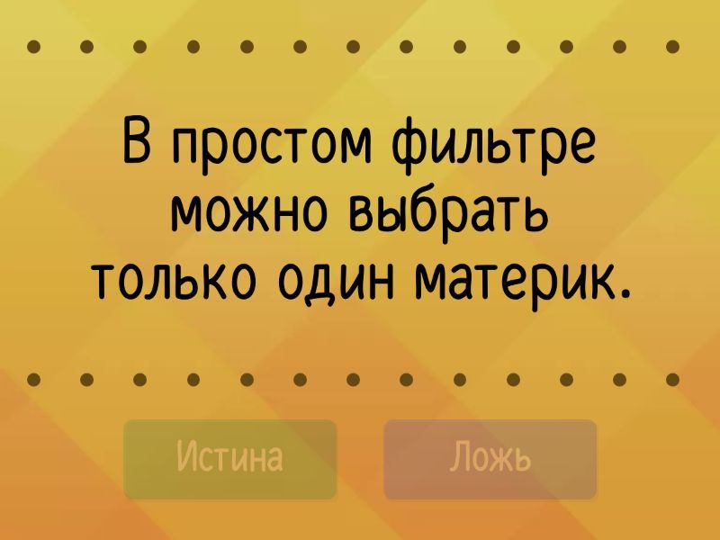 Истина: В простом фильтре можно выбрать только один материк., Расширенный фильтр может выводить результат в другое место., Фильтр можно применять к нескольким столбцам одновременно., Сортировка может менять порядок данных по возрастанию и убыванию., Сортировка работает только с выделенным диапазоном, а не со всей таблицей автоматически., Числовой фильтр позволяет задать условие «между»., Текстовый фильтр может искать строки, которые начинаются с определённого текста., Ложь: Фильтрация удаляет строки навсегда., Числовой фильтр работает только со столбцами текста., Чтобы снять фильтр, нужно удалить весь столбец., Сортировка меняет данные в ячейках (значения превращаются в другие)., Сортировка по алфавиту применяется только к числам., Фильтр можно включить только один раз за всю работу с таблицей.,