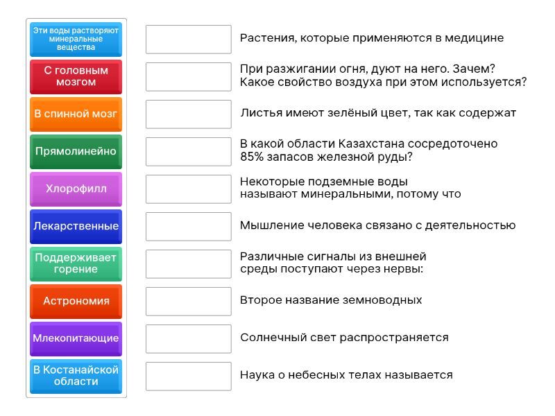 В спинной мозг - Различные сигналы из внешней среды поступают через нервы:, Прямолинейно - Солнечный свет распространяется, Астрономия - Наука о небесных телах называется , С головным мозгом - Мышление человека связано с деятельностью, Поддерживает горение - При разжигании огня, дуют на него. Зачем? Какое свойство воздуха при этом используется?, Хлорофилл - Листья имеют зелёный цвет, так как содержат, Эти воды растворяют минеральные вещества - Некоторые подземные воды называют минеральными, потому что, В Костанайской области - В какой области Казахстана сосредоточено 85% запасов железной руды? , Млекопитающие - Второе название земноводных, Лекарственные - Растения, которые применяются в медицине,