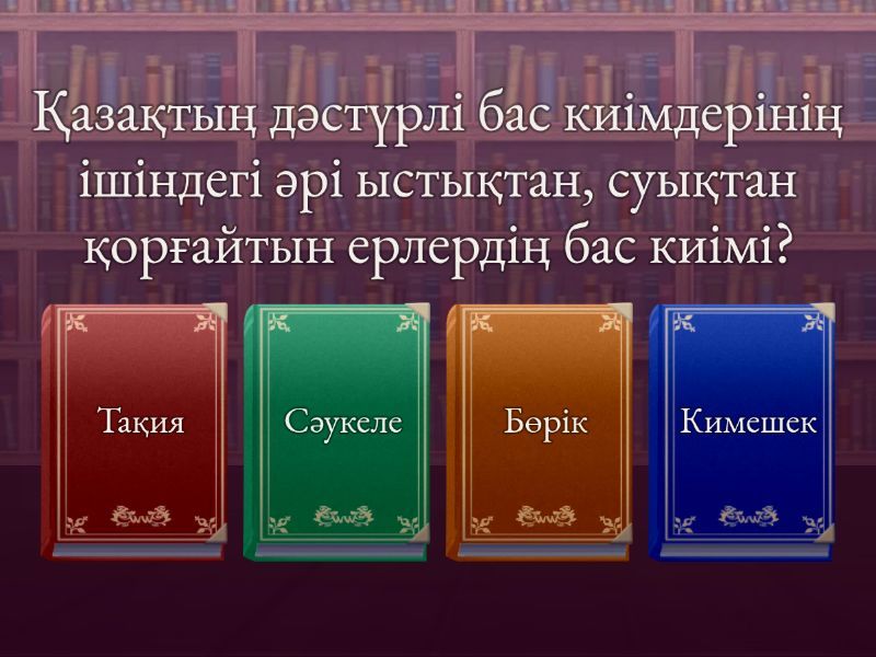 1) Қазақтың дәстүрлі бас киімдерінің ішіндегі әрі ыстықтан, суықтан қорғайтын ерлердің бас киімі? a) Тақия b) Сәукеле c) Бөрік d) Кимешек 2) Қазақ қыздары тұрмысқа шығарда киетін, ерекше әшекейленген, биік, салтанатты бас киім қалай аталады? a) Қасаба b) Жамбас бөрік c) Сәукеле d) Тымақ 3) Ерлер мен әйелдердің жеңіл, жазғы бас киімі, матадан тігілетін, көбіне жіппен кестеленетін түрі? a) Кимешек b) Бөрік c) Тақия d) Қалпақ 4) Қазақтың ұлттық киіміндегі әйелдердің кеудесін жауып тұратын, жағаға тағылатын күміс әшекей? a) А) Сығанақ b) Өңіржиек c) Білезік d) Шолпы 5) Қазақ әйелдерінің шашына тағатын, күмістен жасалған, сыңғырлаған дыбыс шығаратын, бірнеше салпыншақтардан тұратын әшекей? a) Жүзік b) Алқа c) Шолпы d) Тұмар 6) Киімдерді әшекейлеуде жиі қолданылатын, ою-өрнектерді матаға тігу арқылы салатын өнер түрі қалай аталады? a) Құрақ b) Кесте c) Терме d) Аппликация 7) "Қос мүйіз", "төрт құлақ", "сыңар мүйіз" сияқты атаулармен кездесетін, қазақ ою-өрнегінің негізгі элементі? a) Өсімдік тектес ою b) Зооморфтық ою c) Геометриялық ою d) Космогониялық ою 8) Қазақ ұлттық киімінің бір түрі – жеңсіз, ішік тәрізді, тоқыма немесе теріден тігілетін, сән үшін де киілетін сырт киім? a) Күпі b) Шапан c) Кәзекей d) Бешпент 9) Ерлердің қыста киетін, жылы, терімен қапталған, құлағы бар бас киімі? a) Тақия b) Бөрік c) Тымақ d) Сәукеле 10) Ұлттық бұйымдарды (киімдерді, бас киімдерді) әшекейлеу үшін қолданылатын бағалы тас, күміс немесе алтын қоспалармен безендіру әдісі? a) Жіп кесте b) Маржанмен әшекейлеу c) Құрақ құрау d) Қазына (немесе зергерлік) әдіс