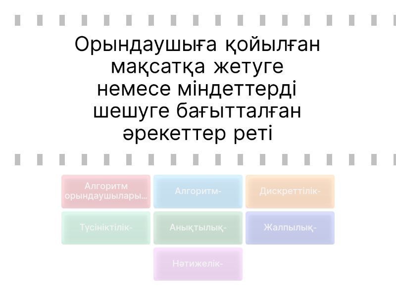 Алгоритм- - Орындаушыға қойылған мақсатқа жетуге немесе міндеттерді шешуге бағытталған әрекеттер реті, Алгоритм орындаушылары... - Адам,есептеуші машинасы немесе автоматты құрылғы, Дискреттілік- - Алгоритм қадамдарға,орындалатын әрекеттерге бөліну керек, Анықтылық- - Алгоритмнің әрбір қадамы нақты,белгілі бір әрекетті орындауға бағытталу керек, Нәтижелік- - Алгоритмнің соңғы қадамы қойылған есептің шешімін ұсынуы керек, Жалпылық- - Есепті шешу алгоритімі жалпы түрде болу керек, Түсініктілік- - Алгоритмнің әрбір қадамы орындаушыға түсінікті болу керек,