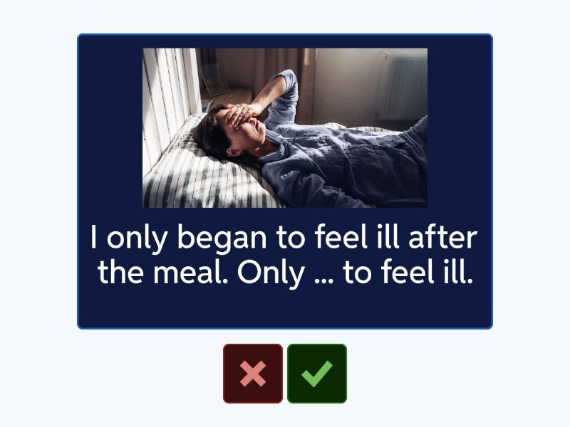 I have never had such amazing food before! Never ... amazing food!, This doesn’t change my opinion in any way. In ... my opinion., I only began to feel ill after the meal. Only ... to feel ill., He was not only arrogant, but also rude. Not ..., but he was also rude., You should not tell anyone about this research under any circumstances. Under ... about this research., I will never forget their kindness. Never ... their kindness.,