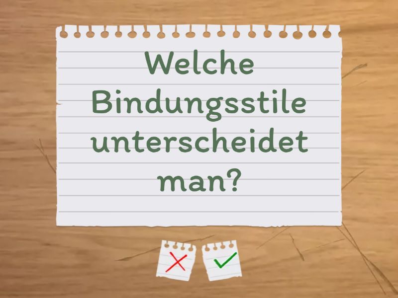 Was versteht man unter „Bindung“? - Enge emotionale Beziehung zu Bezugspersonen, die Sicherheit und Vertrauen vermittelt., Welche Bindungsstile unterscheidet man? - Sicher, unsicher, desorganisiert., Wie wirkt sichere Bindung auf die Wahrnehmung? - Neue Situationen werden als spannend und weniger bedrohlich erlebt., Wie wirkt unsichere Bindung auf die Wahrnehmung? - Neue Situationen werden schneller als gefährlich gedeutet, Kind reagiert ängstlich oder zieht sich zurück., Warum spricht man davon, dass Bindung wie eine „Brille“ wirkt? - Sie beeinflusst, wie Sinnesreize gedeutet werden, ob angenehm oder bedrohlich., Wie reagiert ein sicher gebundenes Kind auf einen bellenden Hund? - Es bleibt neugierig, sucht Schutz bei der Bezugsperson und fragt nach, was passiert., Wie reagiert ein unsicher gebundenes Kind auf einen bellenden Hund? - Es empfindet die Situation als bedrohlich, zieht sich zurück oder zeigt Angst., Wie erlebt ein sicher gebundenes Kind eine neue Erzieherin? - Offen, kontaktfreudig, nimmt Blickkontakt und Stimme positiv wahr., Wie erlebt ein unsicher gebundenes Kind eine neue Erzieherin? - Misstrauisch, zurückhaltend, vermeidet Blickkontakt oder reagiert ängstlich., Wie nimmt ein sicher gebundenes Kind die Berührung einer fremden Tante wahr? - Neutral bis angenehm, akzeptiert Nähe eher problemlos., Wie nimmt ein unsicher gebundenes Kind die Berührung einer fremden Tante wahr? - Als unangenehm oder bedrohlich, lehnt Nähe ab oder zieht sich zurück., Wie reagiert ein sicher gebundenes Kind auf eine laut zuschlagende Tür? - Erschreckt kurz, beruhigt sich aber schnell durch Vertrauen in die Umgebung., Wie reagiert ein unsicher gebundenes Kind auf eine laut zuschlagende Tür? - Empfindet die Situation als stark bedrohlich, zeigt Angst oder Rückzug.,