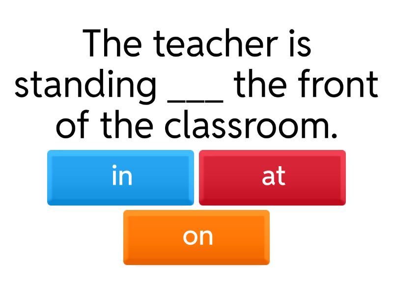1) The teacher is standing ___ the front of the classroom. a) in b) at c) on 2) There is a small house ___ the back of the field. a) in b) at c) on 3) You can see a tall tower ___ the distance. a) in b) at c) on 4) The children are sitting ___ the middle of the room. a) in b) at c) on 5) The paintings are ___ the left side of the corridor. a) in b) at c) on 6) The bookshelves are ___ the right side of the library. a) in b) at c) on 7) The car stopped ___ front of the shop. a) in b) at c) on