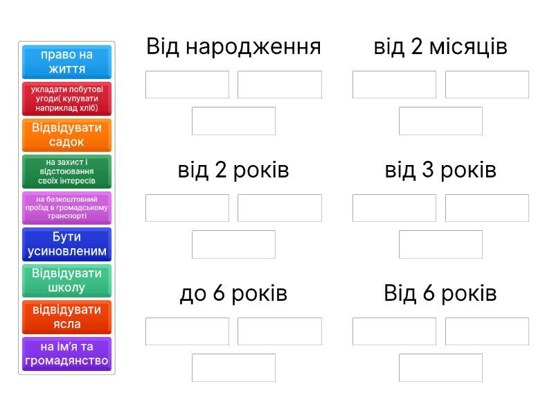Від народження : на захист і відстоювання своїх інтересів , на імʼя та громадянство , право на життя , від 2 місяців : Бути усиновленим , від 2 років : відвідувати ясла , від 3 років : Відвідувати садок , до 6 років : на безкоштовний проїзд в громадському транспорті , Від 6 років : Відвідувати школу , укладати побутові угоди( купувати наприклад хліб) ,
