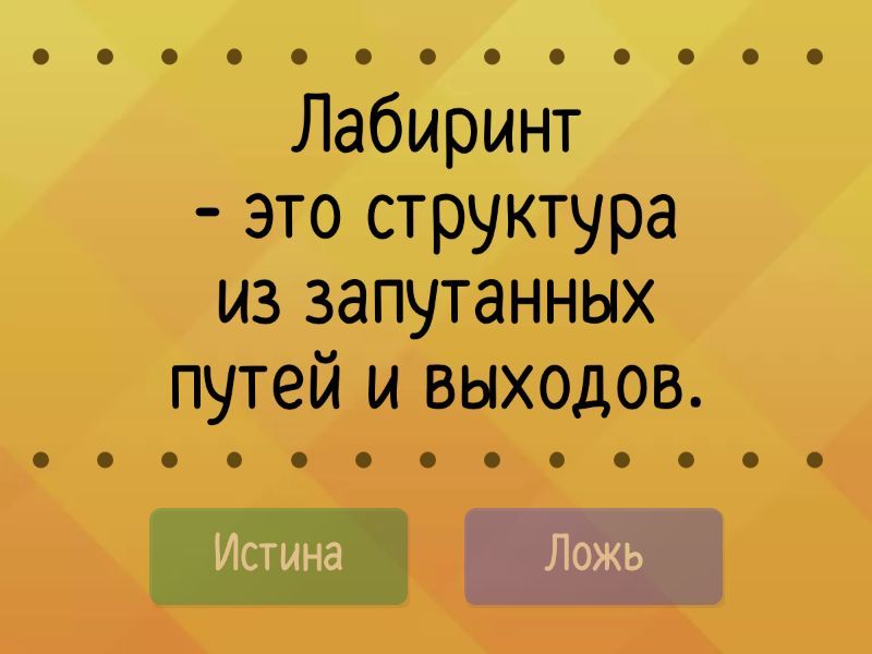 Истина: Лабиринт - это структура из запутанных путей и выходов., Идея прохождения лабиринта — выбраться из тупика, преодолевая препятствия., В программе можно быстро и безопасно найти выход из лабиринта., Ультразвуковой датчик определяет, есть ли перед роботом стена., Ложь: У любого лабиринта всегда только один выход., Робот EV3 не может проходить лабиринты., В древности лабиринты использовались только как украшение.,