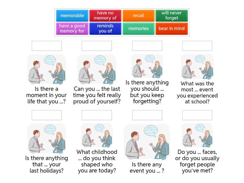 have a good memory for - Do you ... faces, or do you usually forget people you’ve met?, have no memory of - Is there any event you ... ?, recall - Can you ... the last time you felt really proud of yourself?, memories - What childhood ... do you think shaped who you are today?, will never forget - Is there a moment in your life that you ...?, reminds you of - Is there anything that ... your last holidays?, memorable - What was the most ... event you experienced at school?, bear in mind - Is there anything you should ... but you keep forgetting?,