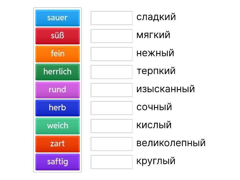 sauer - кислый, herb - терпкий, saftig - сочный, weich - мягкий, zart - нежный, herrlich - великолепный, fein - изысканный, rund - круглый, süß - сладкий ,