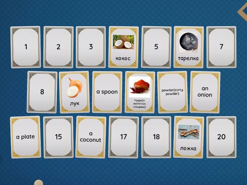 an onion - лук, a coconut - кокос, powder(curry powder) - пудра(о молотых специях), a plate - тарелка, a spoon - ложка, a fork - вилка, a knife - нож, a pan - сковорода, a bowl - миска, a pot - кастрюля,