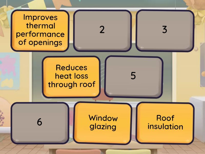 Roof insulation - Reduces heat loss through roof, Window glazing - Improves thermal performance of openings, Boiler type - Determines heating efficiency, Lighting type - Affects electricity consumption,