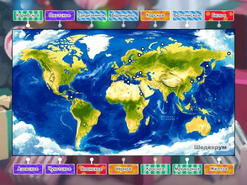 Средиземное, Мраморное, Чёрное, Азовское, Белое, Балтийское, Красное, Жёлтое, Охотское, Японское, Баренцево, Карибское, Карское, Чукотское.