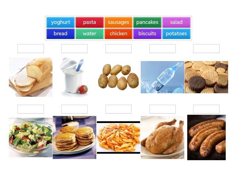 biscuits , tuna, bread, cereal, chips, ham, pasta, vegetables , pancakes , water, cheese, chicken, meat, orange juice, potatoes, rice, salad, sandwiches, sausages, yoghurt,