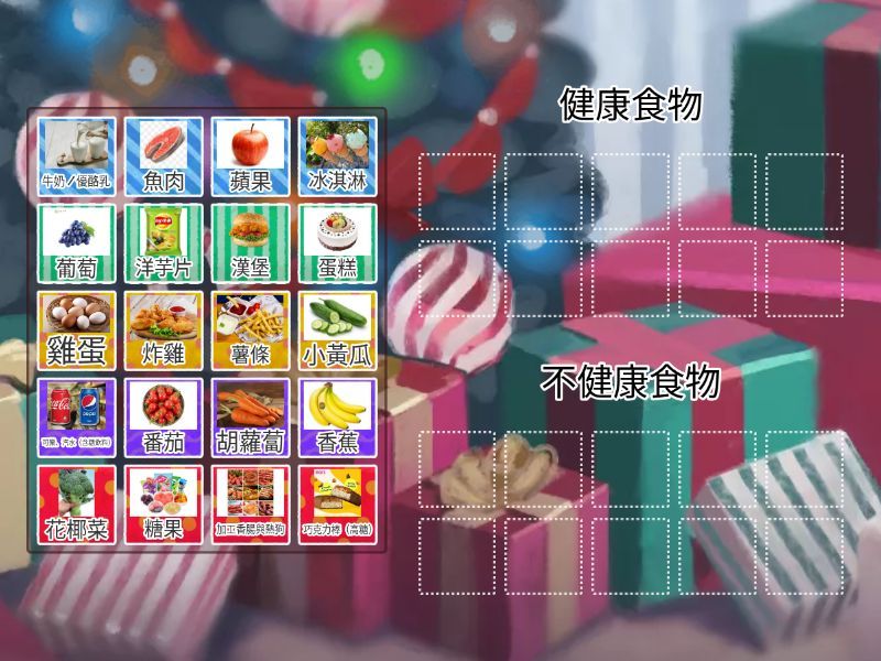 健康食物: 蘋果, 香蕉, 葡萄, 胡蘿蔔, 小黃瓜, 番茄, 花椰菜, 魚肉, 雞蛋, 牛奶 / 優酪乳, 不健康食物: 洋芋片, 薯條, 炸雞, 漢堡, 糖果, 巧克力棒(高糖), 可樂、汽水(含糖飲料), 冰淇淋, 蛋糕, 加工香腸與熱狗,
