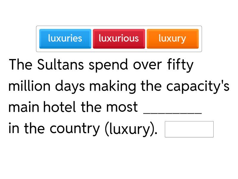 The Sultans spend over fifty million days making the capacity's main hotel the most ________ in the country (luxury). ____ Police is working on solving the bank robbery have _____ by chance a plan to murder a leading politician (cover). ____ We should go and eat at "Franco's" wich is _______ a great little reataurant (suppose). ____ A person left home at 8 a.m., saw the garage empty in ______ , and realized their car had been stolen. (believe) ____ Roger can help you find things because he is very ____ (help). ____ You paid $25 for a simple breakfast? They have a certain ____ you! You should go back and complain (charge).____ The gang robbed three banks, and NO ____ , the police caught them. (surprise) ____ Sarina is only my half sister because we have____mothers (differ) diferent ____