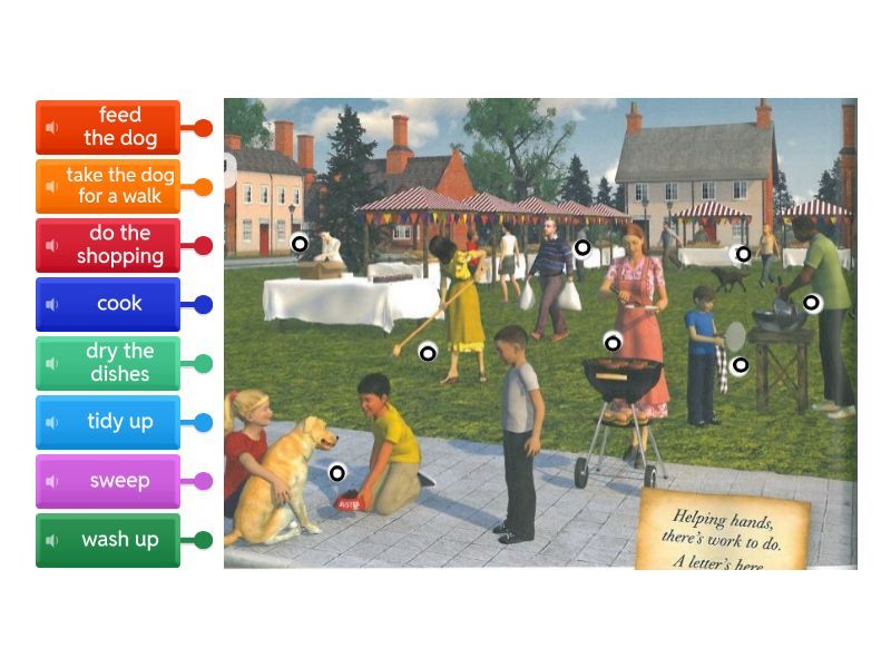 tidy up, do the shopping, take the dog for a walk, wash up, sweep, cook, dry the dishes, feed the dog.