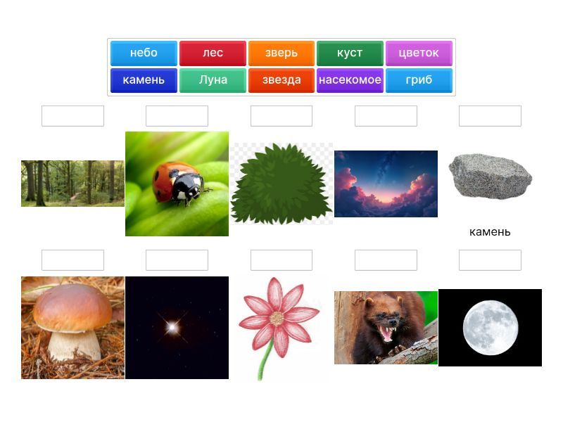 рыба, птица, насекомое, зверь, Солнце, звезда, небо, облако, Луна, лес, дерево, цветок, куст, трава, гриб, поле, река, гора, море, камень - камень,