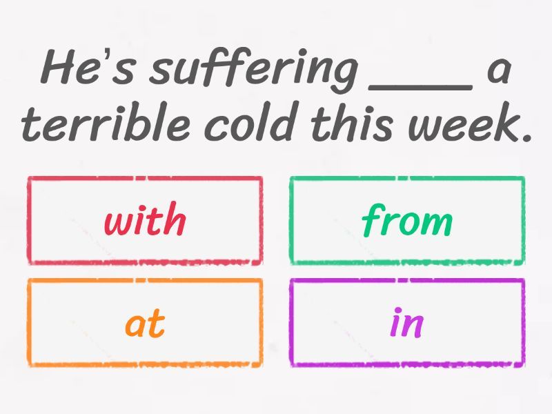 1) He’s suffering ____ a terrible cold this week. a) with b) from c) at d) in 2) I think you’ve mistaken me ___ someone else. a) with b) to c) for d) at 3) They limited ___ five people per group. a) at b) in c) to d) for 4) I admire her ____ her dedication to helping others. a) at b) for c) with d) about 5) It’s been a stressful week, but she’s managing to cope ____ everything. a) with b) at c) in d) to 6) I like to communicate ______ my friends online every day. a) in b) with c) for d) from 7) She’s still recovering ____ the flu. a) with b) from c) in d) for 8) This new show really appeals ____ young audiences with its relatable characters. a) to b) for c) with d) at 9) They’re trying to prevent him ____ making the same mistake again. a) with b) in c) from d) at 10) He didn’t know how to say it ___ her without upsetting her feelings. a) for b) - c) with d) to 11) The school provides students ____ all the necessary study materials. a) for b) with c) at d) to 12) She prides herself ___ being a good listener and friend. a) in b) of c) about d) on 13) Let me introduce you ____ my best friend; I think you’ll get along. a) at b) to c) for d) with 14) I would prefer tea ___ coffee any day of the week. a) at b) with c) to d) for 15) The teacher tried to explain ___ the class how the new project would work. a) - b) to c) at d) for 16) The room was filled ____ laughter during the game night. a) of b) in c) with d) from 17) She just graduated ____ high school and is excited for college. a) at b) for c) with d) from 18) They congratulated him ____ winning the championship. a) with b) in c) on d) at 19) Mark applied ___ three universities and is waiting to hear back. a) for b) to c) at d) in 20) His views differ ____ mine on many topics. a) from b) with c) in d) for 21) The teacher divided the class ____ four groups for the project. a) for b) with c) at d) into 22) The movie is based ___ a true story about an inspiring athlete. a) in b) on c) to d) from 23) Can I borrow this book ____ you for a few days? a) at b) from c) with d) to 24) He was fined ____ parking illegally in the city. a) with b) at c) to d) for 25) They often argue ____ each other about small things. a) to b) with c) at d) for 26) I need to concentrate ___ finishing my homework right now. a) on b) for c) of d) at 27) He has really benefited ____ the extra tutoring this year. a) with b) from c) at d) about 28) Don’t interfere ____ the work until it’s done! a) on b) at c) with d) to 29) They invited us ____ their party next weekend. a) at b) to c) for d) with 30) The siblings were separated ____ each other during the trip. a) at b) with c) to d) from 31) He’s actively engaged ___ several after-school activities. a) to b) at c) with d) in 32) Can you describe the problem ____ me in detail? a) for b) to c) with d) at 33) He didn’t mean to lie ___ his parents, but he was nervous about their reaction. a) with b) for c) to d) about 34) The movie ended ___ a surprising twist that no one expected. a) in b) at c) on d) to 35) She spent too much money ___ clothes this month. a) to b) on c) at d) in 36) The company supplies us ____ office supplies every month. a) with b) for c) to d) from 37) We spent hours searching ____ the perfect spot to camp. a) with b) for c) to d) - 38) I like to listen ___ music while I study. a) for b) to c) in d) - 39) How did your teacher react ___ your idea? a) on b) to c) for d) at 40) The book was translated from French ____ English. a) at b) into c) for d) on 41) They were suspected ____ breaking into the house. a) with b) on c) at d) of 42) Let’s stick ____ the plan we made earlier. a) at b) to c) in d) for 43) His injury resulted ____ a sports accident last week. a) in b) from c) at d) with 44) It led ___ a disaster! a) at b) with c) in d) to 45) His reckless driving resulted ___ a bad accident. a) with b) in c) from d) to 46) This sunscreen will protect you ____ sunburn. a) from b) with c) to d) at 47) They’re preparing ____ the big test next week. a) at b) to c) for d) with 48) He objects ____ the new school rules. a) at b) for c) to d) with 49) He commutes ___ work by train every morning. a) at b) for c) with d) to 50) The surgeon will operate ___ him for a knee injury tomorrow. a) - b) at c) in d) on 51) The repair costs were estimated ____ $500. a) for b) at c) with d) in 52) She apologized to her friend ____ being late to the party. a) at b) in c) with d) for 53) They blamed him ____ the mistake, even though it wasn’t his fault. a) in b) for c) at d) on 54) The doctors were able to cure him ___ the infection. a) for b) with c) of d) about 55) She truly cares ____ the environment and tries to reduce waste. a) about b) with c) to d) of