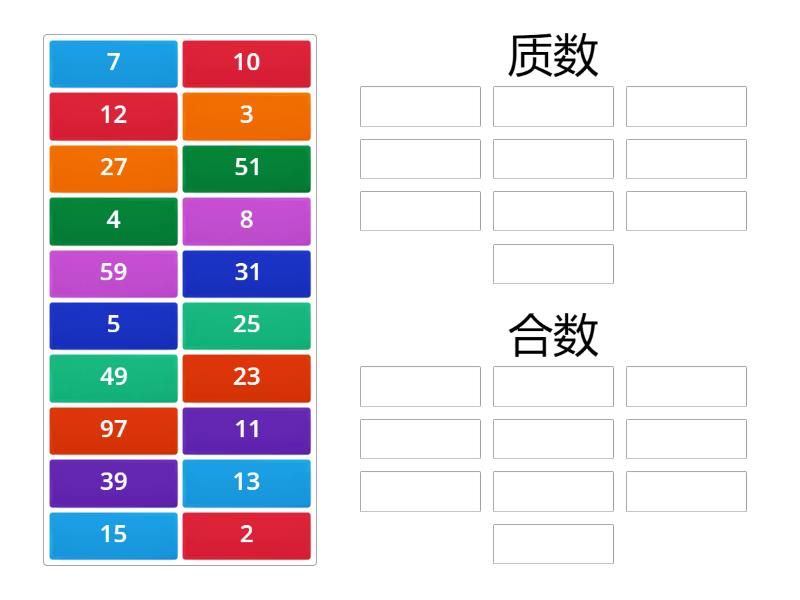 质数: 11, 23, 13, 59, 97, 31, 2, 3, 5, 7, 合数: 12, 15, 25, 27, 39, 49, 10, 4, 8, 51,