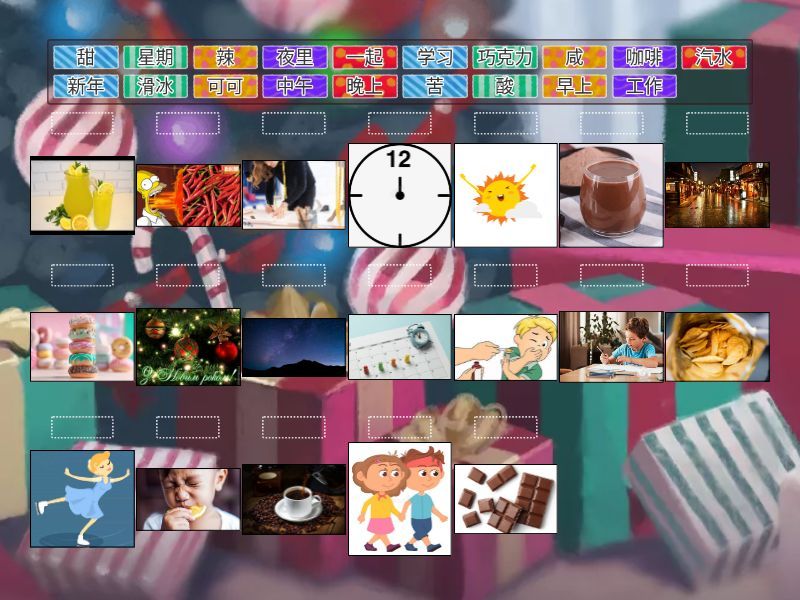 星期, 汽水, 咖啡, 早上, 晚上, 夜里, 中午, 学习, 工作, 一起, 滑冰, 辣, 酸, 苦, 甜, 咸, 巧克力, 可可, 新年,